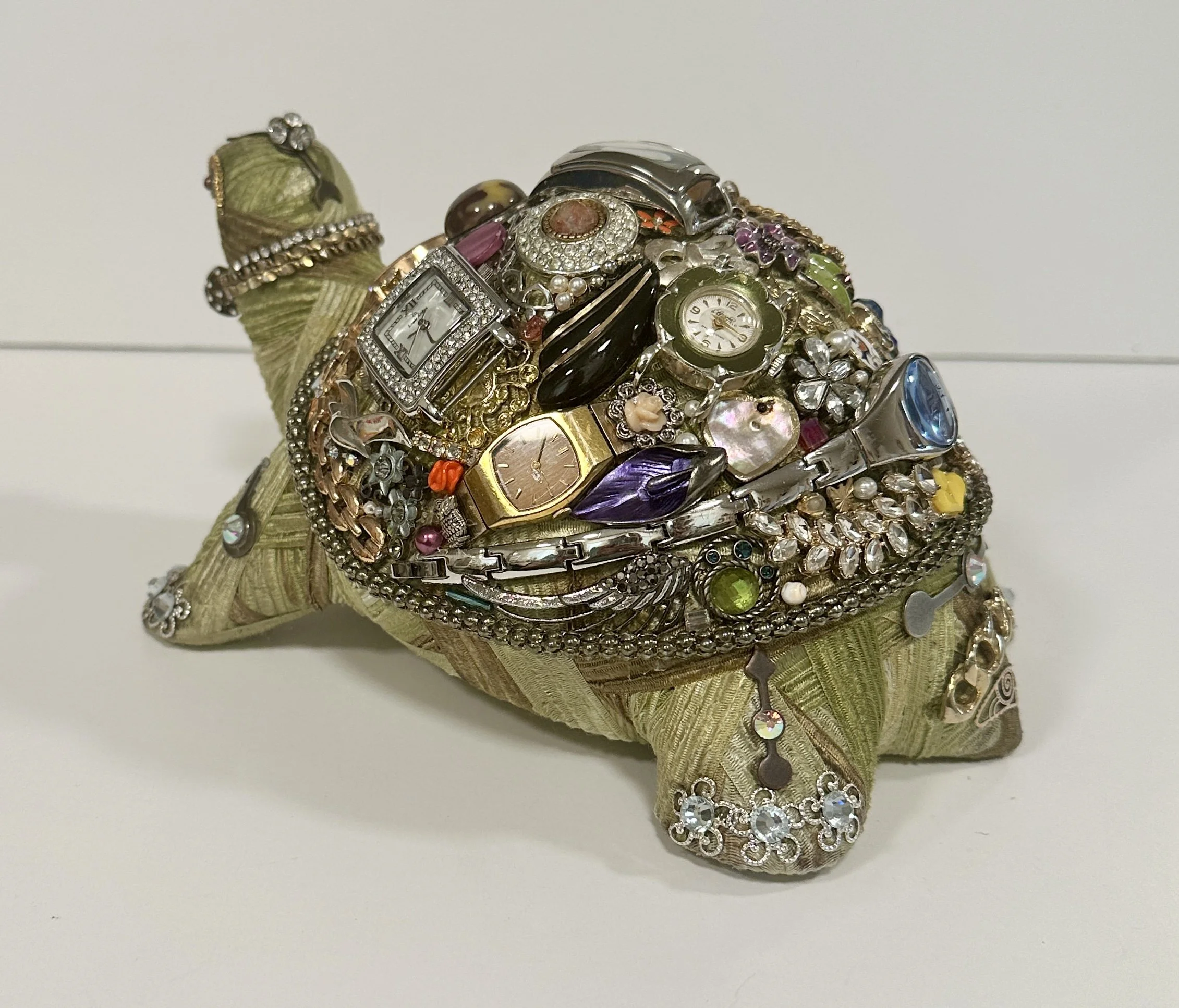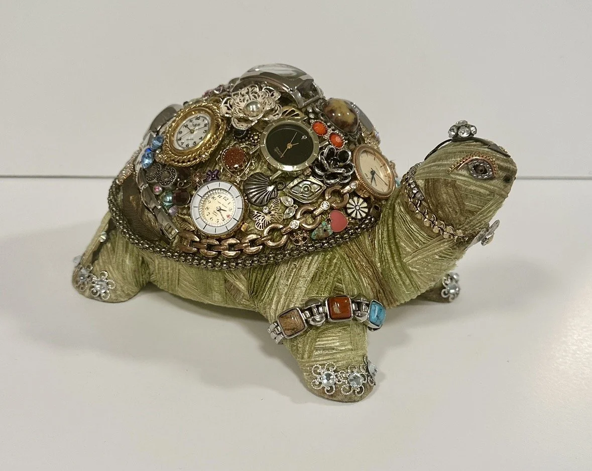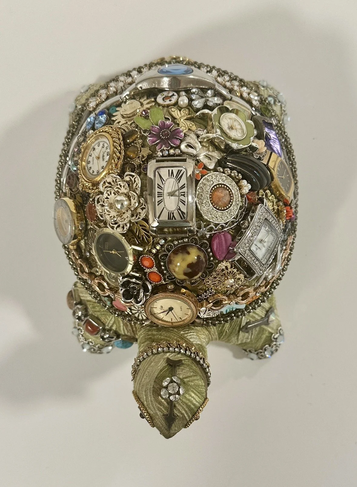 I have been delving into new projects and experimenting with new ideas. Along with my usual wrapping technique, I have been adding more vintage jewelry and jewelry parts to my projects. I have always loved jewelry and currently I volunteer at White Dove Thrift Shop in Phoenix which is a part of the Hospice of the Valley organization. Both my mom and dad were taken care of by HOV and they do wonderful work. I currently research and price jewelry that comes in through donations, and I work with another volunteer and the store manager. We get so many wonderful donations from families of patients and the public. The jewelry parts I use in my projects mostly come from other thrift stores or online shops and some are even given to me by friends and customers. I don’t get freebies from HOV!! My biggest project to date is a large turtle….he is approximately 8x6” and I use old watches and watchfaces I purchase at thrift stores and online thrift organizations. I have pictures below. I don’t think I will be selling him as yet! Still perfecting the right adhesive for large jewelry attachment!
